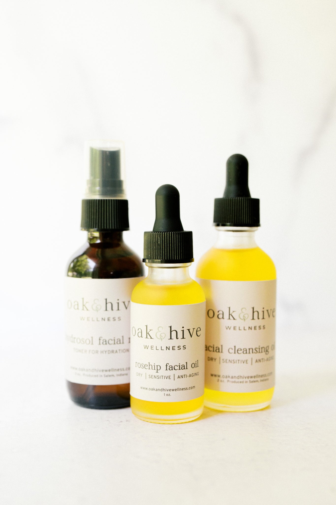 This set includes: Cleansing Oil for Dry/Sensitive/Mature Skin, Hydrosol Toning Spray, Rosehip Facial Oil with the option of adding the Repair Facial Serum and the Renew Pressed Eye Serum.